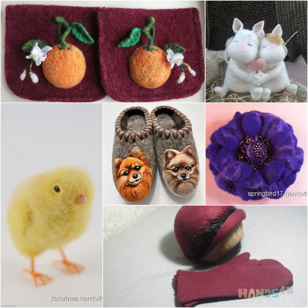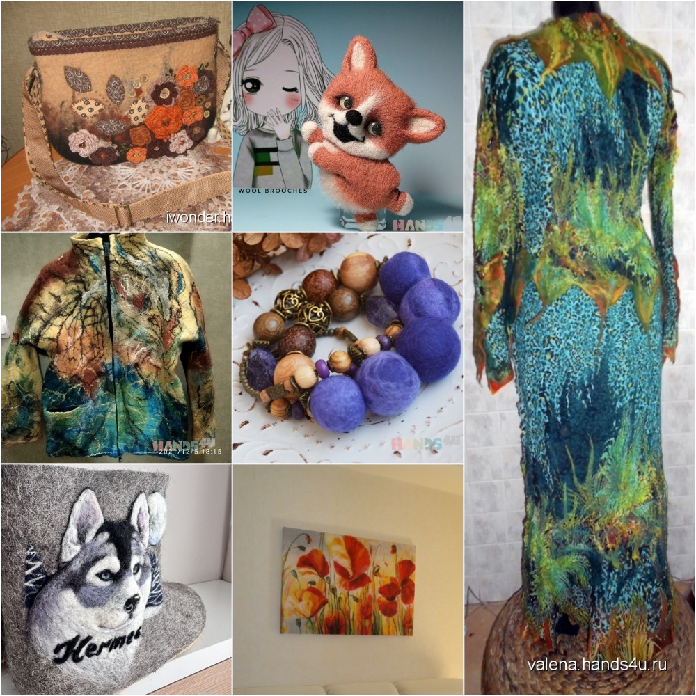 В технике мокрого валяния чаще всего делают различные предметы гардероба (жилеты, шарфы, шапки, тапочки, валеночки), сумки и кошельки, панно и коврики, цветы и украшения.