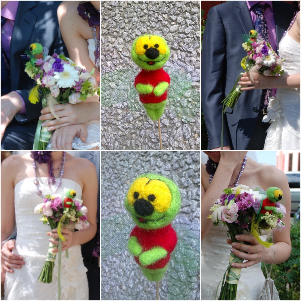 Пример украшения свадебного букета фигуркой, выполненной в технике сухого валяния.