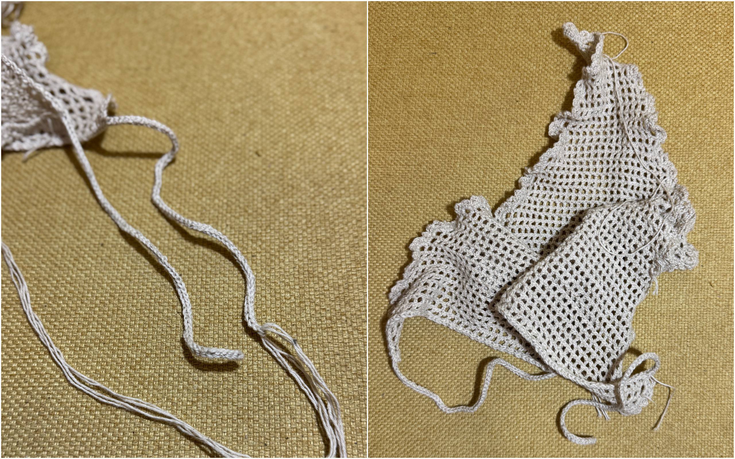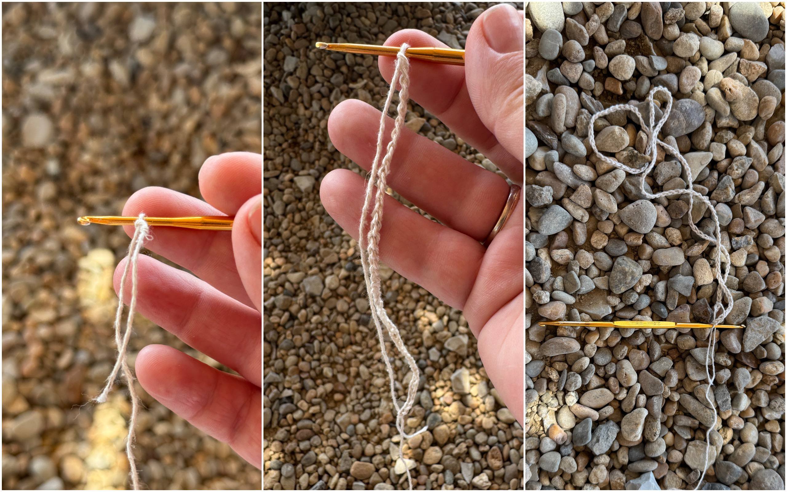 1. Наберите цепочку из воздушных петель (в моём случае — 136). Можно сделать с запасом, лишние распустить, и мерить не по первому ряду воздушных, а непосредственно по узору, так будет лучше понятно натяжение. Размер цепочки я примеряла по собственной голове так, чтобы между краями вязания оставалось расстояние для завязок и бантика.