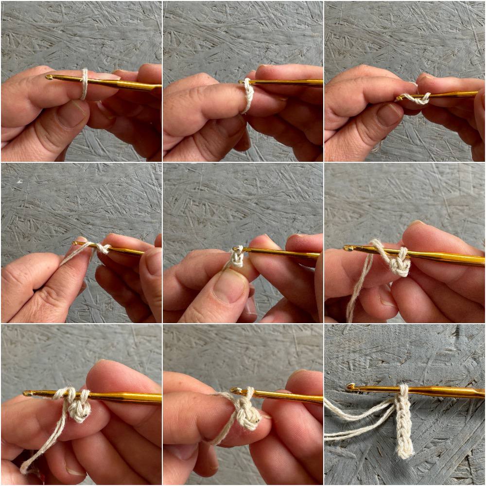 Рабочая нить лежит на указательном пальце. Свяжите начальную петлю, затем захватите на крючок нить, которая лежит на пальце ближе к вам, потом подцепите заднюю нить и протяните её через получившиеся 2 петельки.