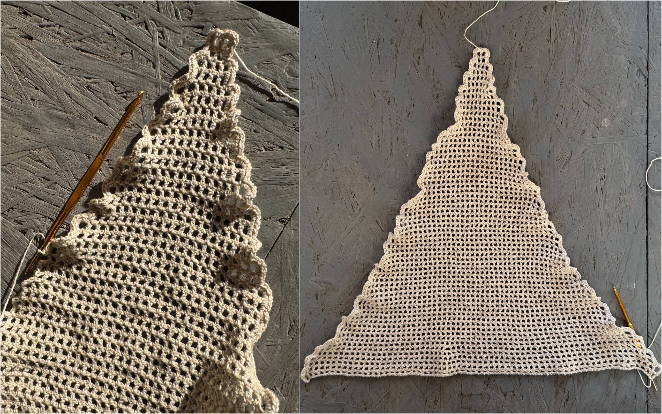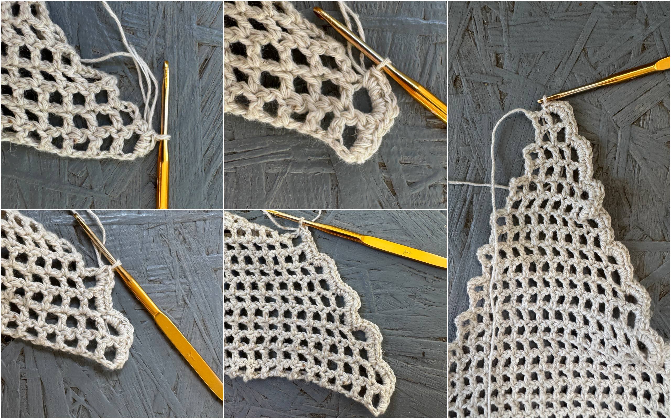 2. Каждые два ряда косынка будет сужаться. Для того, чтобы в 3 ряду начать вязание узора на ячейку позже, провяжите петли над первой ячейкой соединительным столбиком.