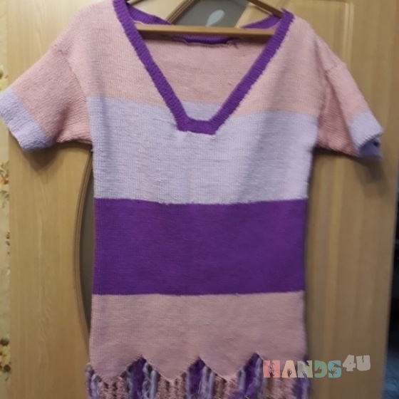 Джемпер ручной вязки новый, полотно тонкое. Размер 44-46. Объем бедер 94 см. Длина 72 см (до бахромы). Состав пряжи: акрил, мериносовая шерсть, кашемир. Существует в единственном экземпляре