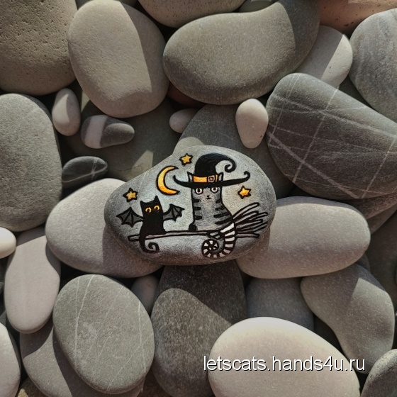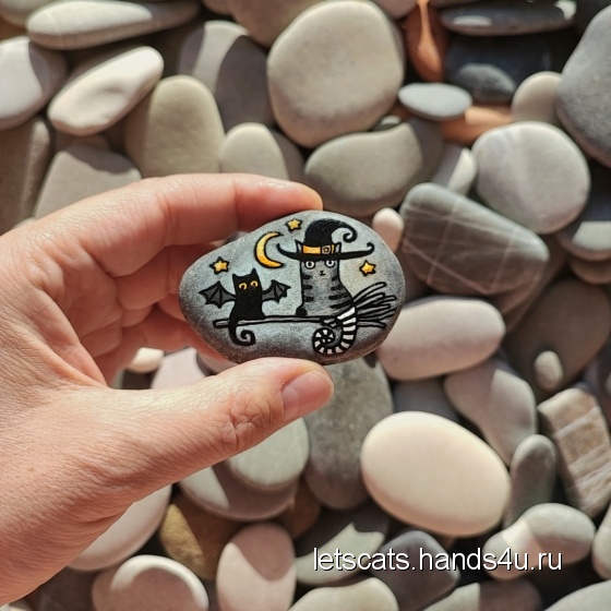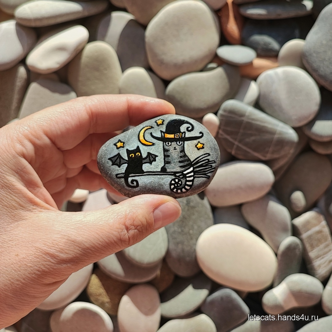 Нашла морской камешек и расписала его - ведьма-кошка и ее любимая кошка с крыльями. Они летят в ночном небе на метле.