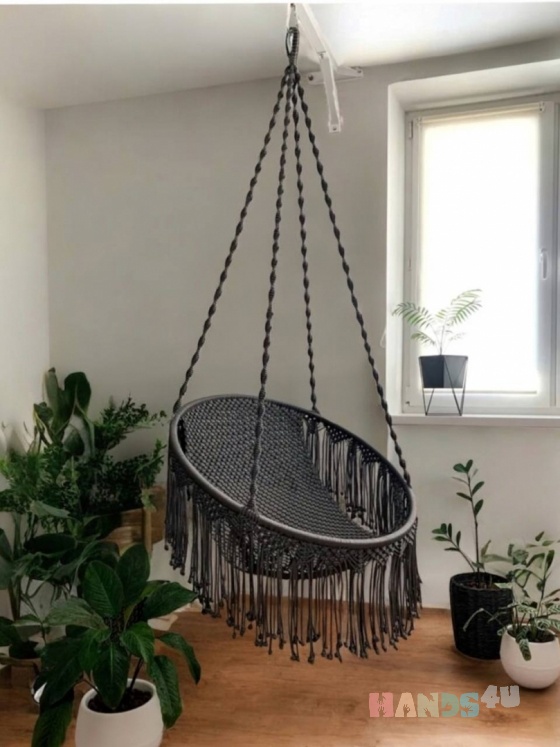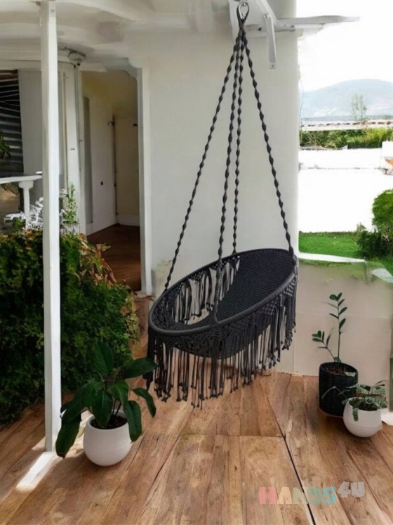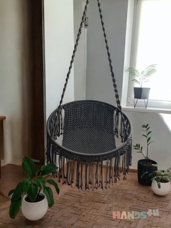 Гамаковый шнур не боится влаги, его можно стирать, поливать из садового шланга, оставлять под открытым небом. Гамаковый шнур не боится температурных перепадов и устойчив к непогоде. Конструкция кресла состоит из гамакового шнура и металлических колец из профильной трубы (кольца покрыты антикоррозионной краской).