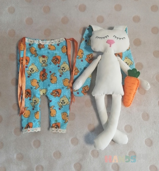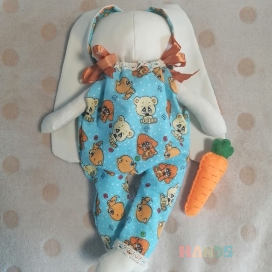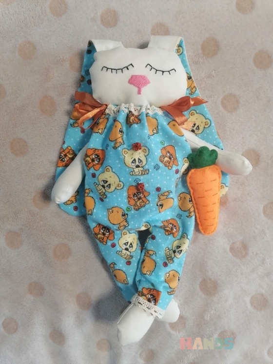 Комбинезон снимается. Мордочка вышита. Наполнитель зайки и морковки синтепух, материал комбинезона - фланель, пуговки - объемная вышивка.