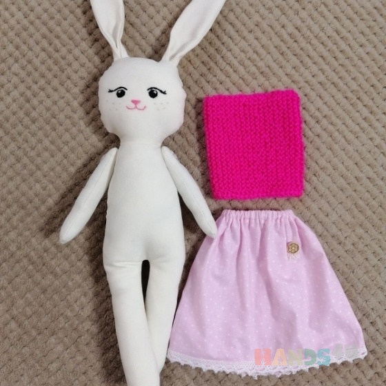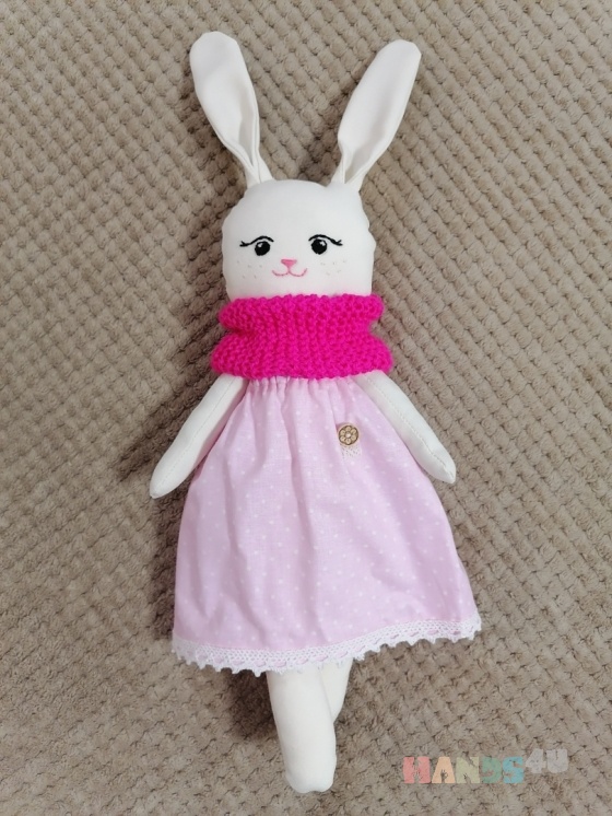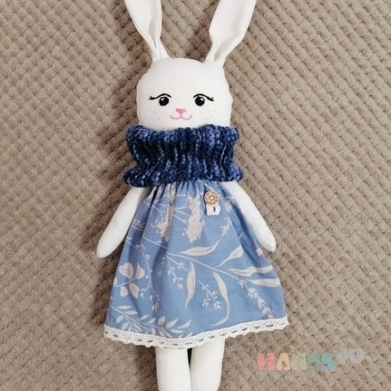 Зайчик со сменным комплектом одежды (2 платья, 2 шарфика). Мордочка вышита, ручки подвижные за счет пуговок. Размер без учета ушек 35 см.