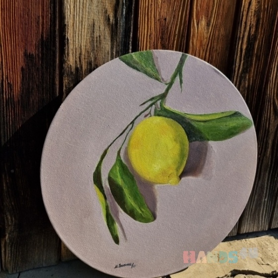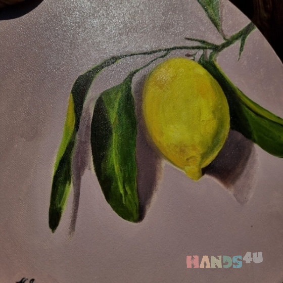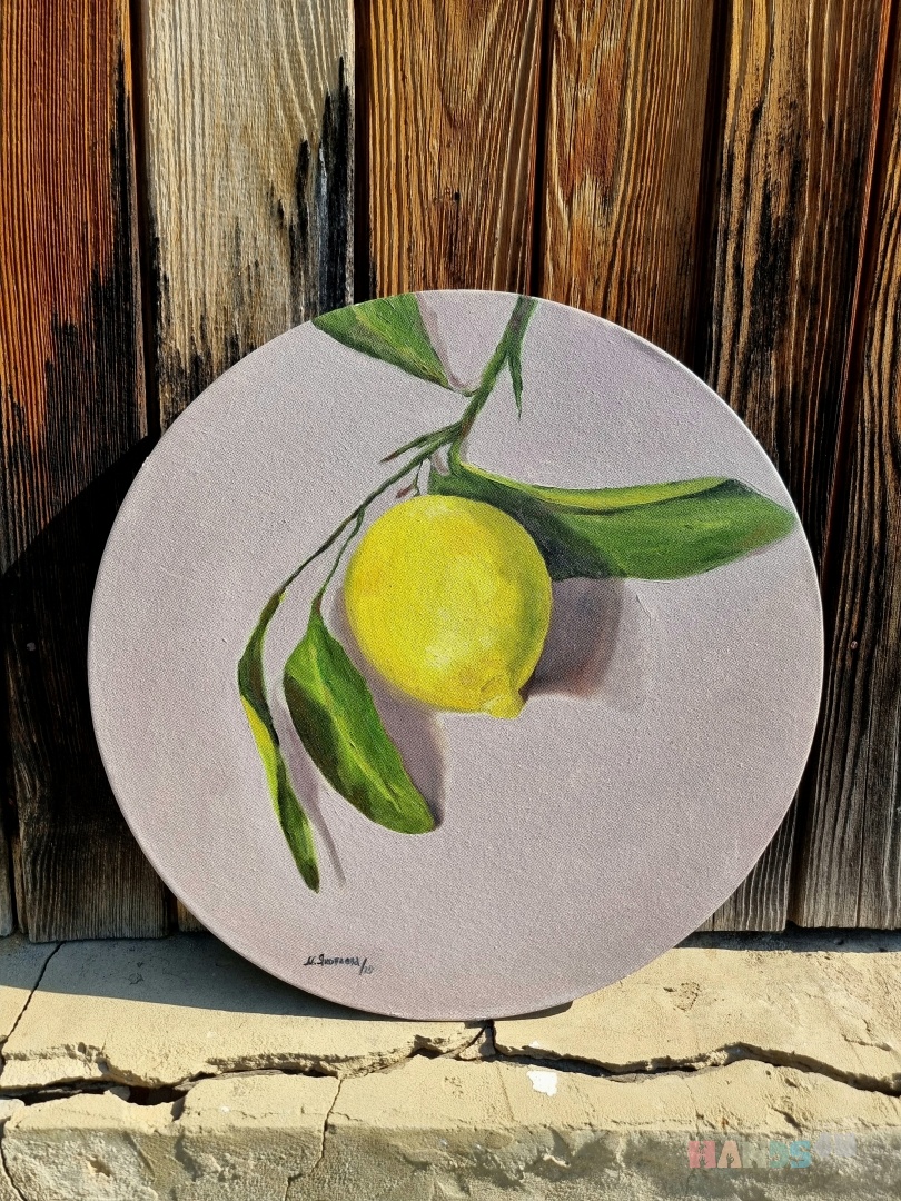 Круглая картина лимон была написана маслом в 2020 году, авторская, холст на картоне, покрыта лаком, диаметр 40 см. Объемная, яркая, сочная картина принесет ярких красок в ваше пространство, освежит и дополнит интерьер.