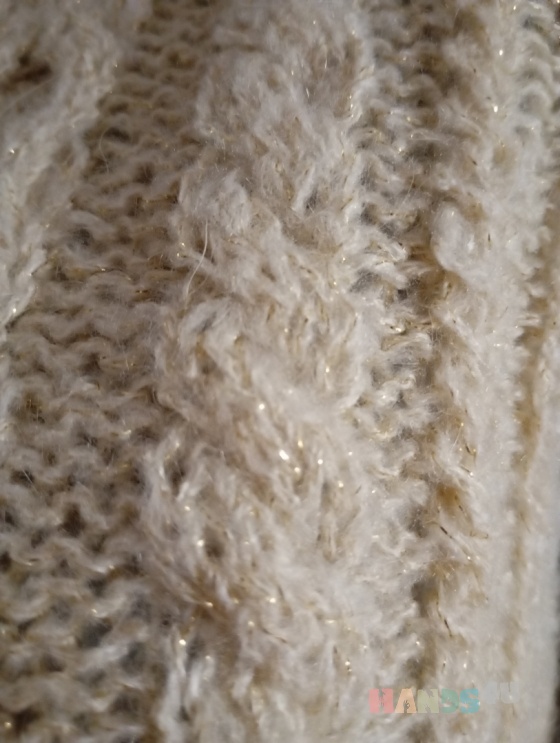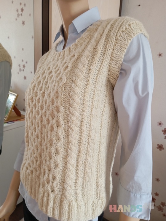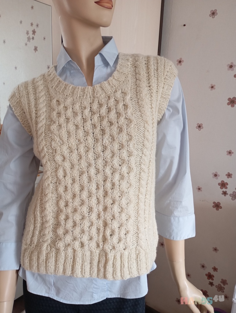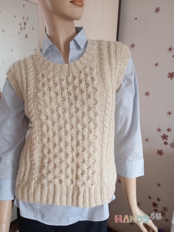 Теплая безрукавка молочного цвета связана из итальянской пряжи. В составе: шерсть, мохер, акрил. Пряжа с нитью люрекса.