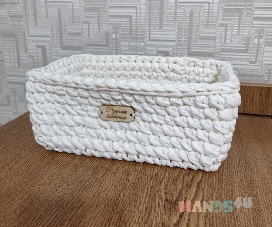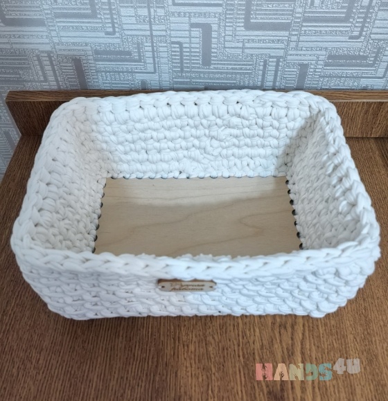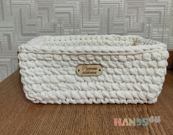 Корзинка вязаная крючком из трикотажной пряжи. Размер пряжи 7-9мм. Цвет молочный. Деревянное донышко в корзинке размером 15х20см. Корзинка подходит под хранение любых мелочей: ключи, украшения, средства гигиены, игрушки и многое другое. Высота корзинки 9,5 см. Ширина по верхней части 23 см. Следует избегать попадания влаги, изделие предназначено преимущественно для сухих предметов. Регулярно стряхивайте с корзинки пыль. Если образовалось пятно, протрите его мыльным раствором, но не трите щёткой, используйте губку.
