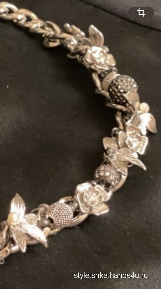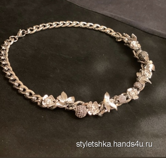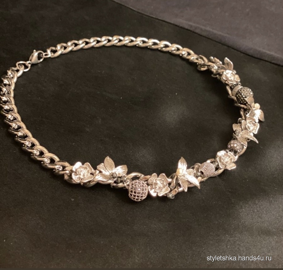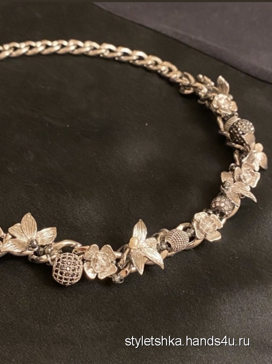Ожерелье с использованием фурнитуры серебряного цвета (цветы, лепестки, бусины).