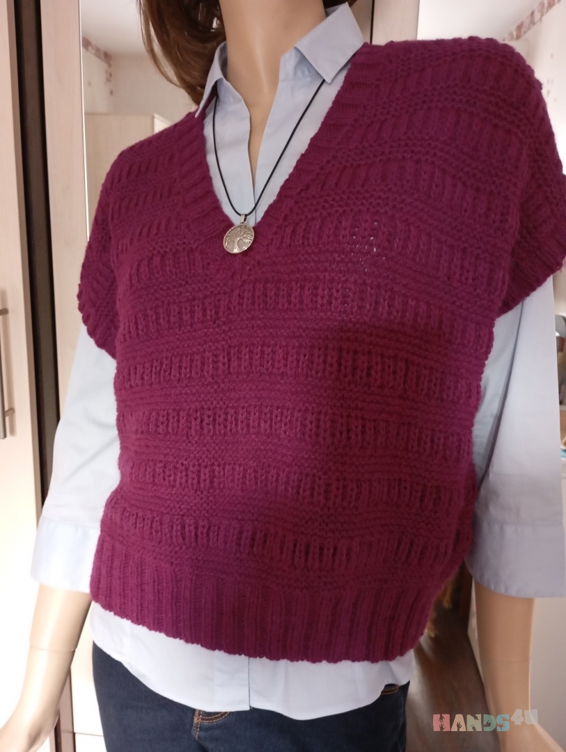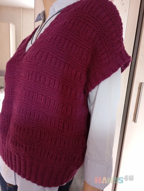 Жилет свободного кроя, единый размер с V образным вырезом и спущенным плечом, цвет цикламен. Связан из итальянской пряжи: меринос, шерсть лама, акрил.