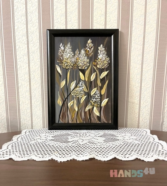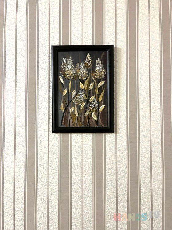 Эта картина представляет собой сочетание природы и искусства, вдохновение от красоты осеннего дня. Центральным элементом является густая трава, окрашенная неяркими оттенками охры и коричневого цвета, подчеркивающими основной колорит осени. Для придания траве объема использована текстурная паста, создающая эффект трехмерности и глубины.