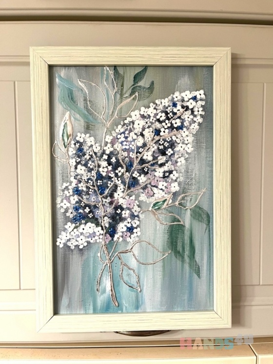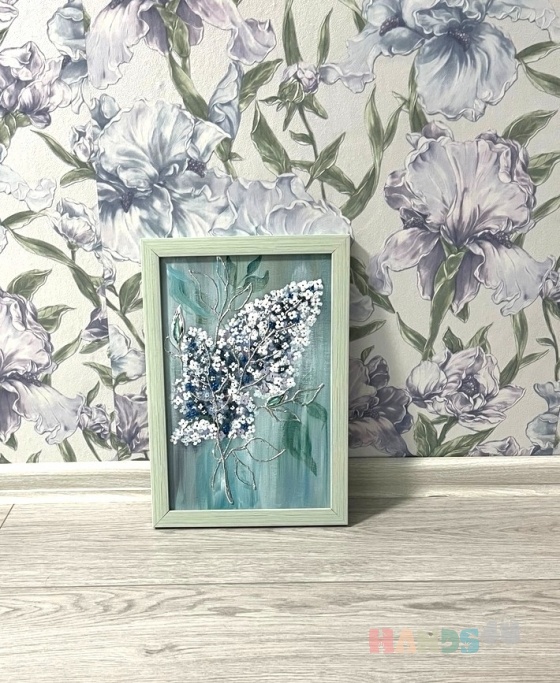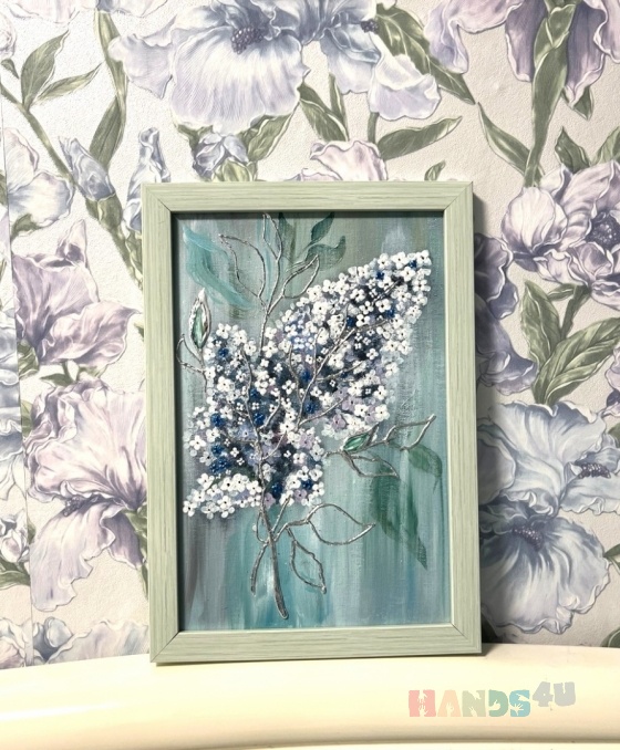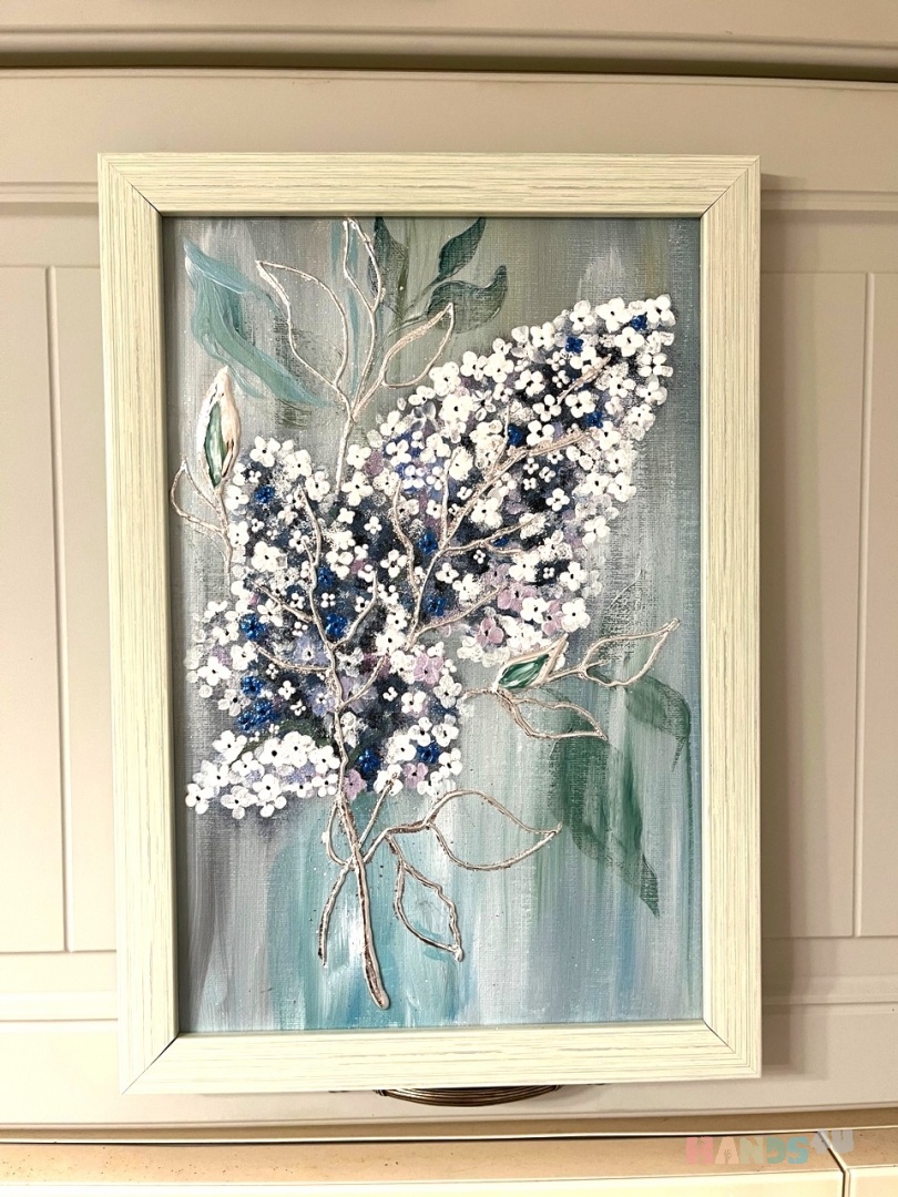 Картина представляет собой небольшую работу, выполненную акриловыми красками с использованием техники нанесения контурной пасты и элементов серебряной потали. Центральным мотивом композиции является изящная веточка сирени, занимающая значительную часть пространства . Фоновое пространство заполнено мягким сочетанием светлых оттенков синего и зеленого цветов, создающих ощущение свежести и легкости весеннего утра. Оформлена в рамку похожего оттенка.