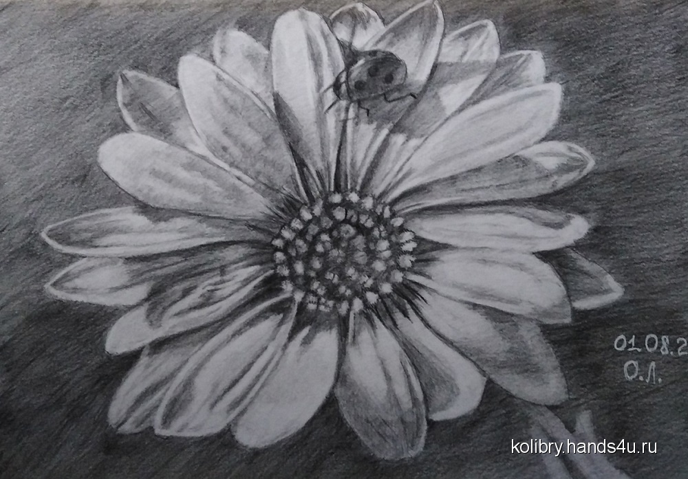 Детальный карандашный рисунок, наполненный светом и летним настроением. На листе бумаги формата А4 расцветает нежный цветок, а на нём притаилась божья коровка — символ удачи. Эта кропотливая работа, выполненная графитным карандашом, станет прекрасным акцентом в интерьере и будет ежедневно дарить вам ощущение тепла и безмятежности