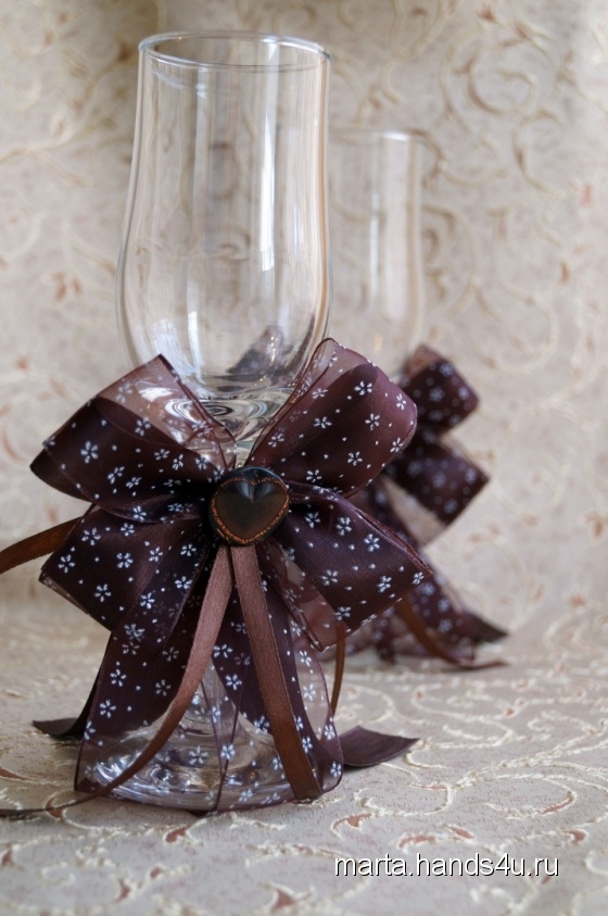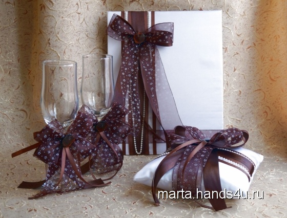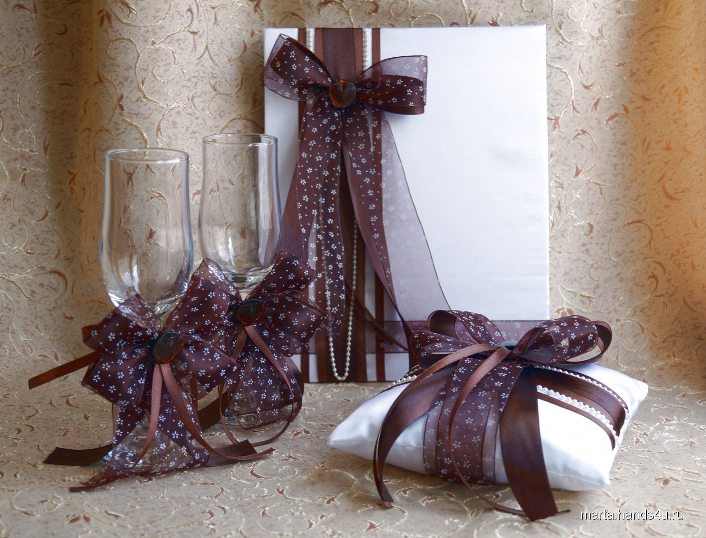 Красивый шоколадный набор состоит из 4 предметов: подушечка для колец (20х20), папка для свидетельства о браке, съемные украшения для бокалов. Бокалы в набор не входят. Если вы хотите приобрести и бокалы, стоимость за пару составит 300 р.